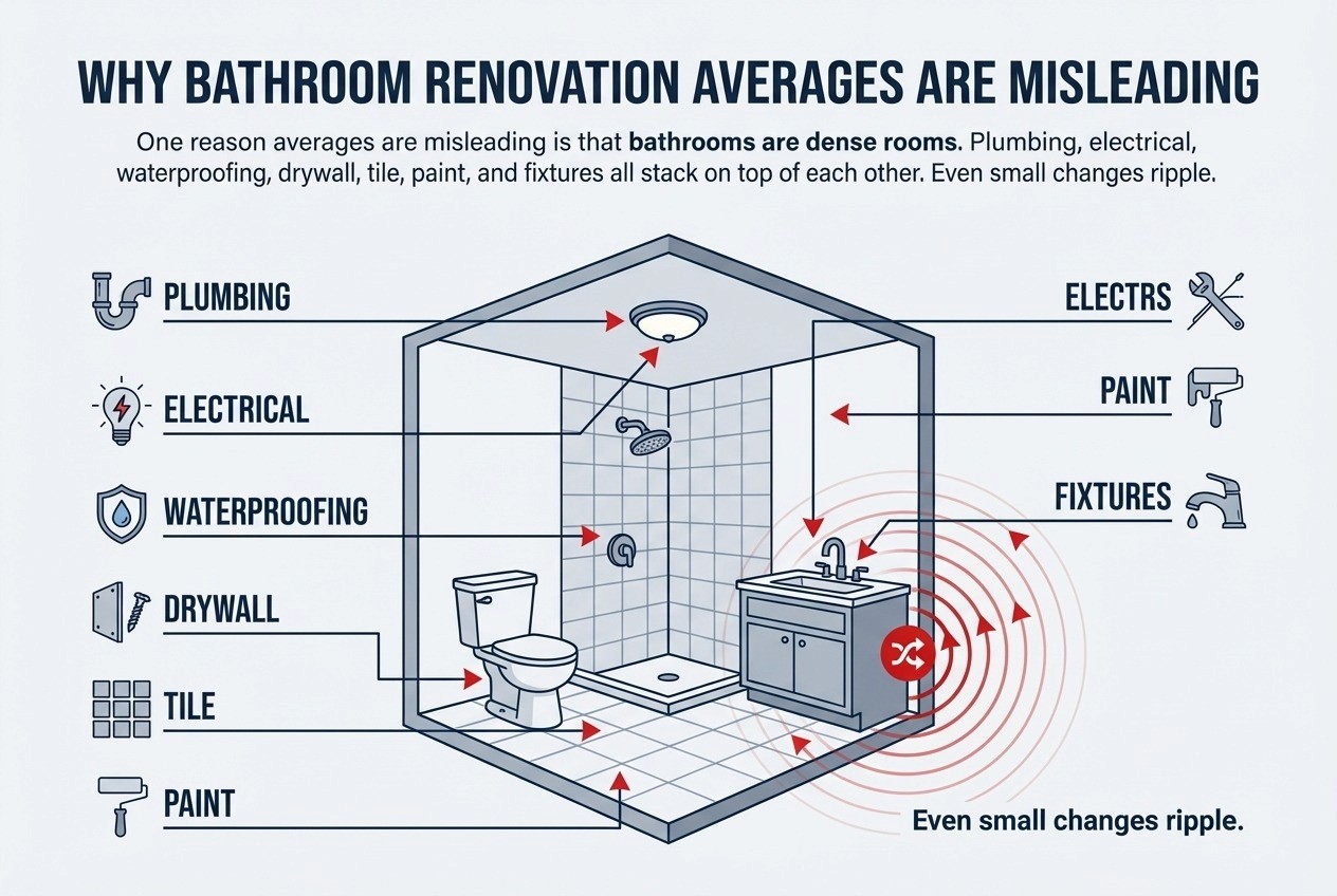 Those ranges overlap on purpose. A small bathroom with extensive tile work can cost more than a larger bathroom with simpler finishes. Labor intensity matters more than square footage.