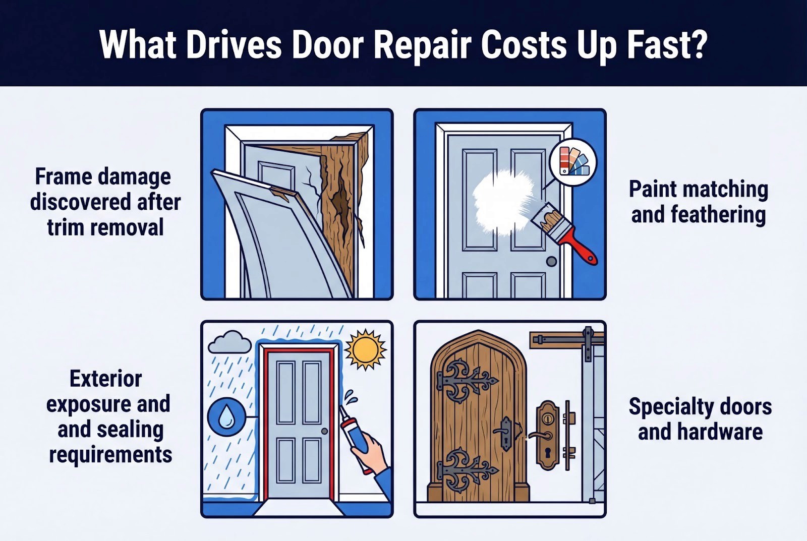Front door repairs tend to run higher than interior door repairs, even when the scope looks similar.