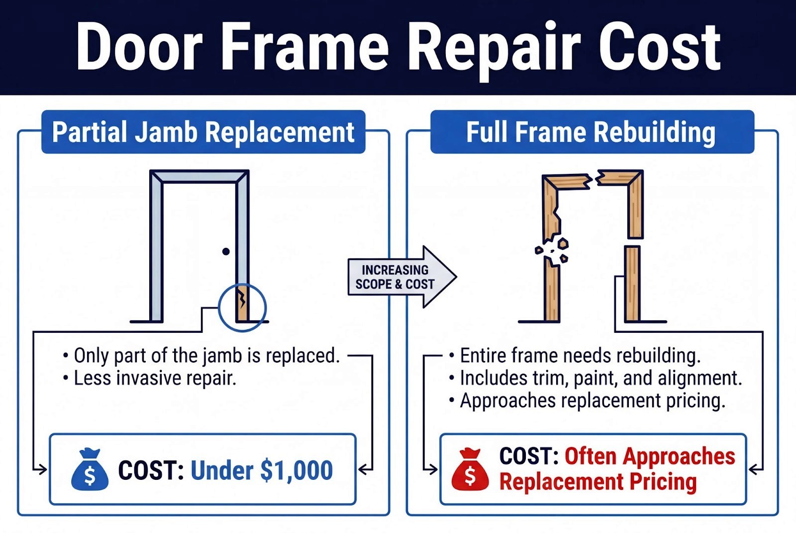 Door frame repairs are among the most expensive fixes because they combine structural carpentry with finish work.