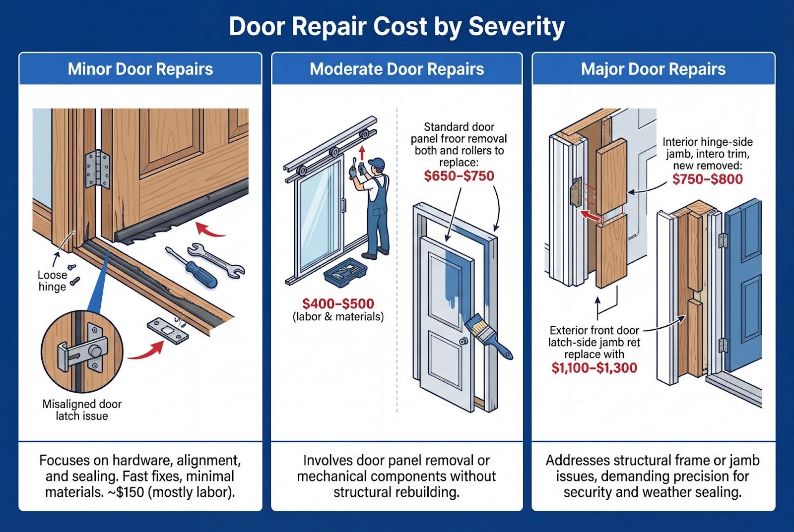 Minor door repairs often stay under $200 when limited to hardware or alignment.