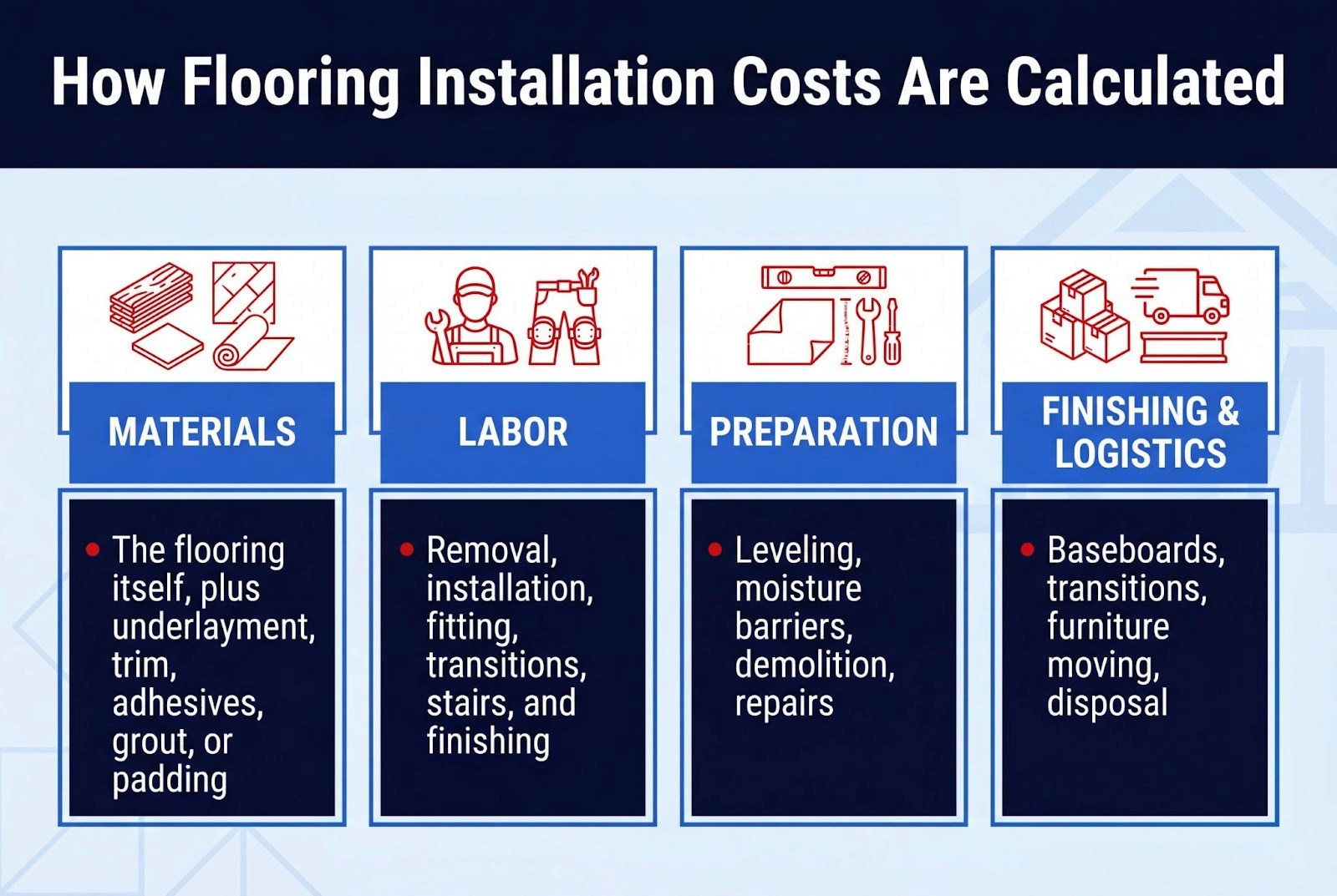 Flooring installation cost is made up of four separate buckets: